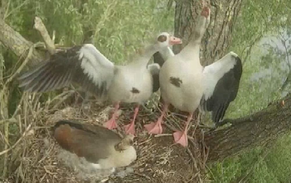 Gelukkig voor de broedende nijlgans laat de steenmarter zich niet meer zien. Echter betekent dit niet dat ze nu in alle rust kan broeden. Een ander koppel nijlganzen verstoord de rust weer. Wanneer ze weer alleen is, laat ze mooi haar negen eieren zien.