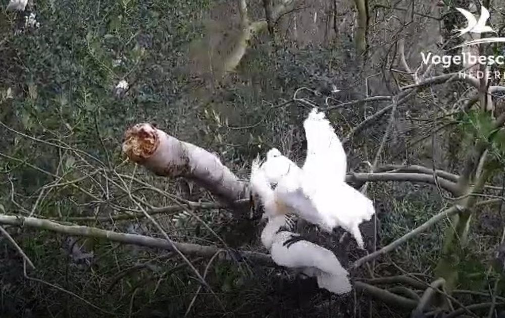 De boef. Het mannetje van het voorste paar vliegt weg om takken te halen. Het mannetje van het achterste koppel paart met het voorste vrouwtje.
