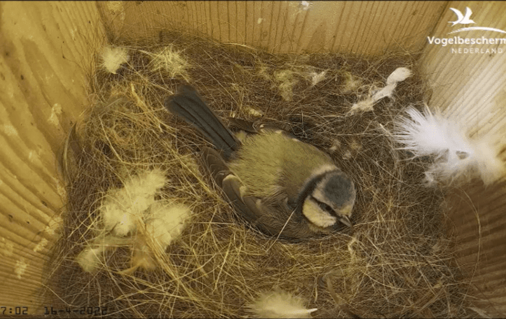 Gisteren was vrouw pimpelmees al flink bezig met de nestkom en bleef ze soms langere tijd op de eieren zitten. Zou er nog een ei komen?