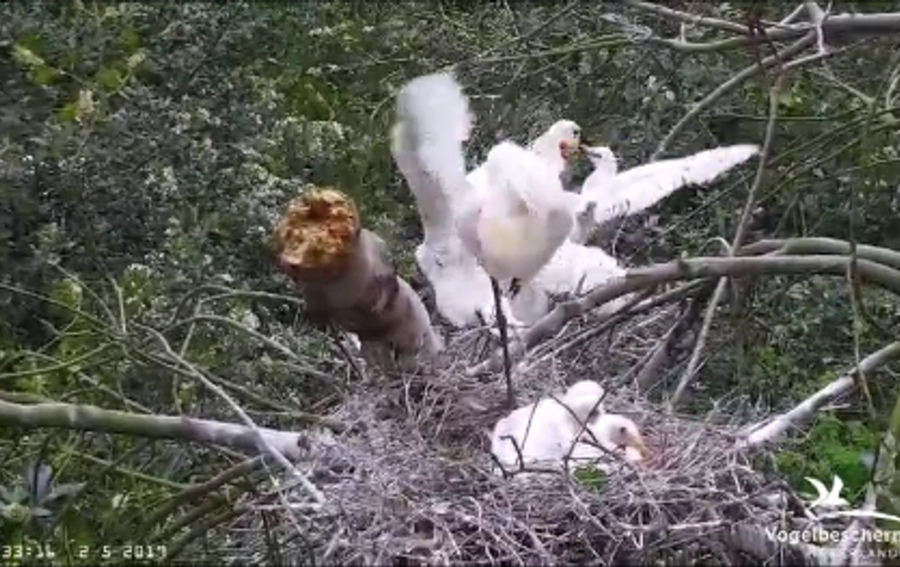 Je kon er eigenlijk een beetje op wachten dat dit zou gebeuren. Tijdens een van de chaotische voederingen kiepert er een jong overboord