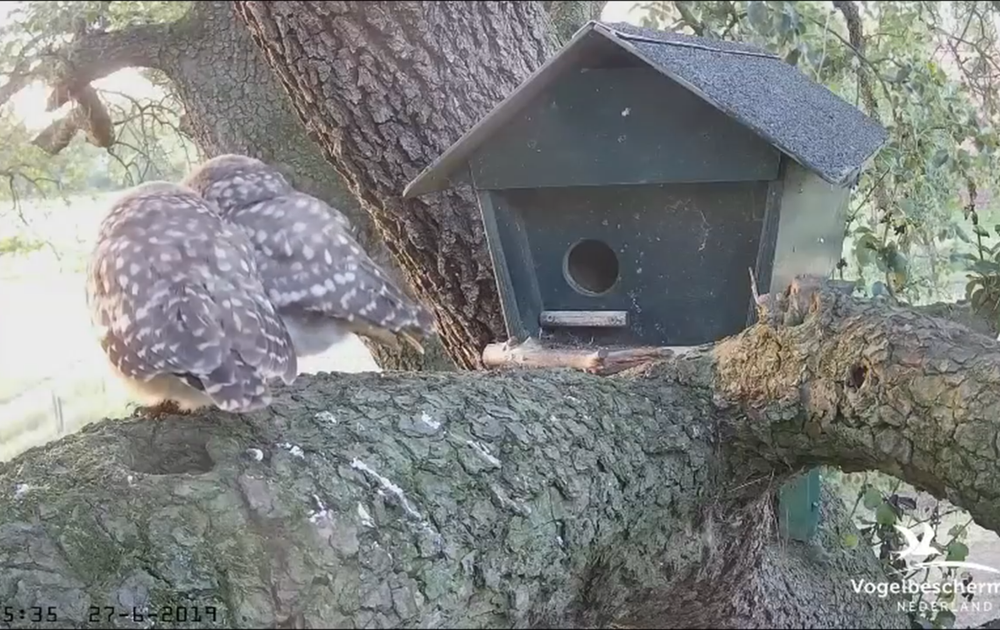 De uitgevlogen jongen zijn actief voor de nestkast.