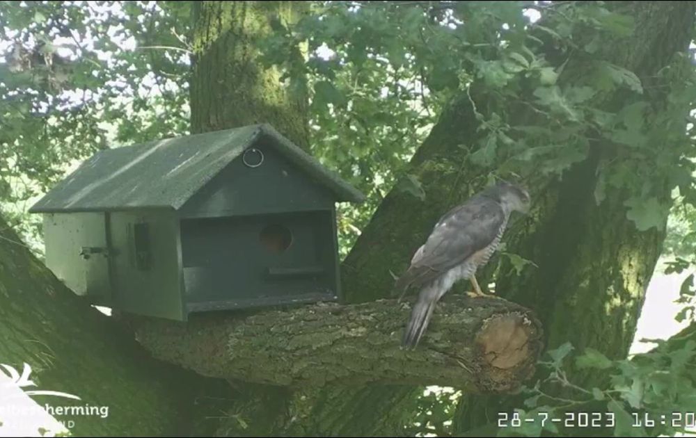 Twee jongen vluchten erg snel de nestkast in. Er blijkt een grote rover in de buurt te zijn, een sperwer-vrouw.