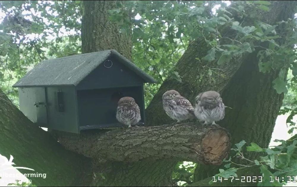 Het is nog steeds druk bij de nestkast. Jongen en bezoek in beeld op 14 juli.