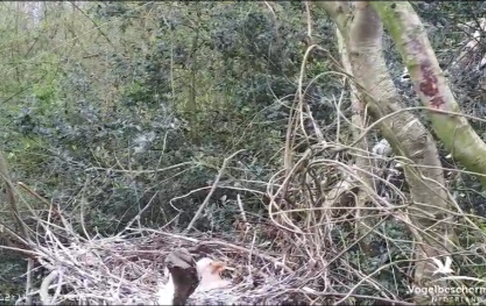 Normaal wisselen man en vrouw op het nest. Nu ging het even iets anders. Man vliegt door het beeld en wacht een tak hoger tot ie naar het nest kan. V vliegt dan maar weg, waardoor de jongen heel even alleen zijn. Maar na een paar seconde komt man naar het nest. De jongen worden flink gevoerd