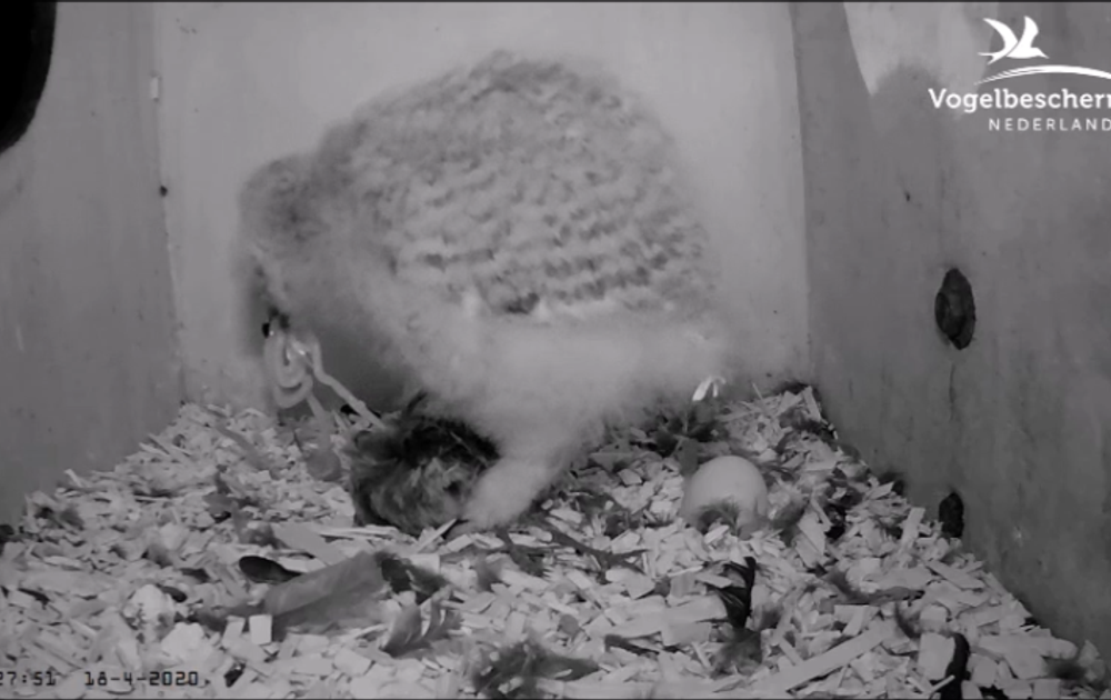 In de loop van de nacht gaat het uilskuiken aan de gang met de restprooi van de vogel die eerder was binnen gebracht. Kleine plukjes wordt er af of uit getrokken maar ook een deel van de vleugel en een lange sliert (darm).