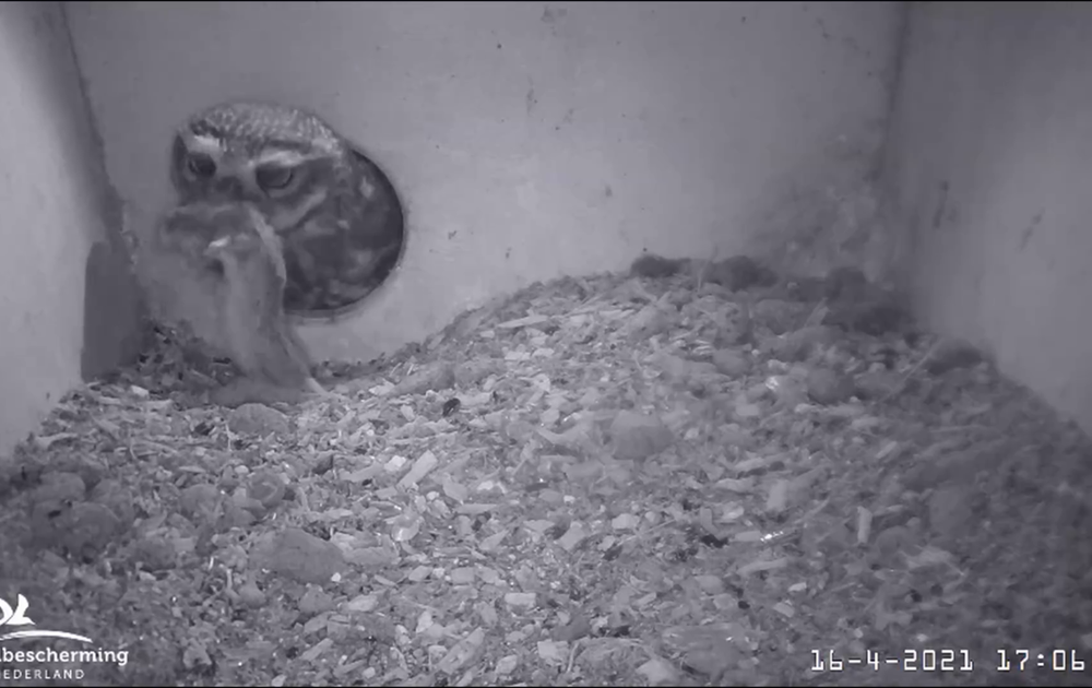 Vrouw steenuil geeft Man geen kans bij de restprooi tekomen.