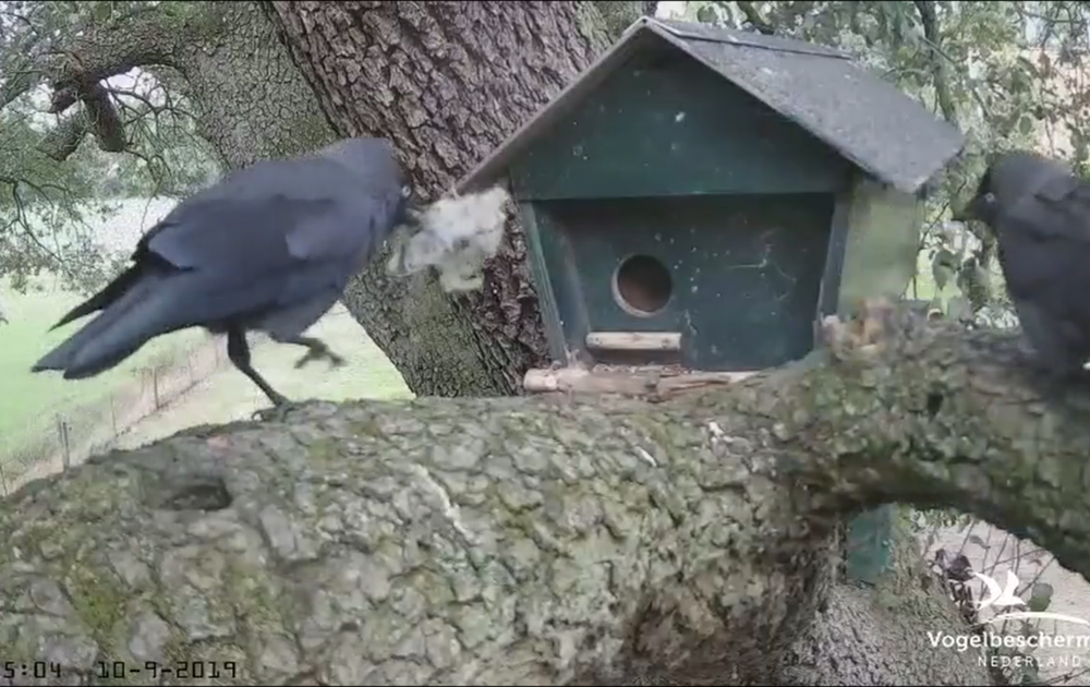 Kauw neemt een pluizenbol mee naar de nestkast. Andere kauwen hebben ook belangstelling, een deel komt uiteindelijk in de nestkast terecht.