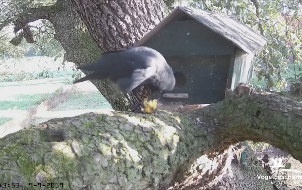 Kauwen nemen peren mee in de perenboom om ze te eten. Het eten is een sociaal gebeuren bij kauwtjes.