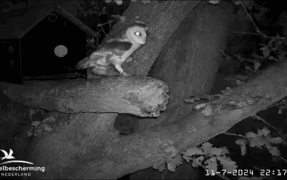 Een rechtsgeringde kerkuil landt voor de steenullnestkast. Binnen de kortste tijd wordt de kerkuil verdreven. Kijk goed hoeveel steenuilen aanvallen.