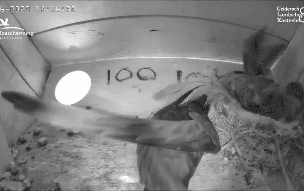 De gierzwaluwkuikens hebben het steeds gezelliger in het nestje. Als een jong beweegt, bewegen de anderen mee.