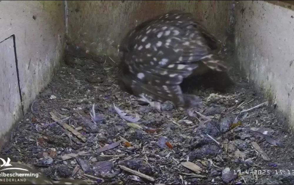 Man steenuil brengt na ongeveer 24 uur weer wat te eten in de nestkast aan Vrouw.