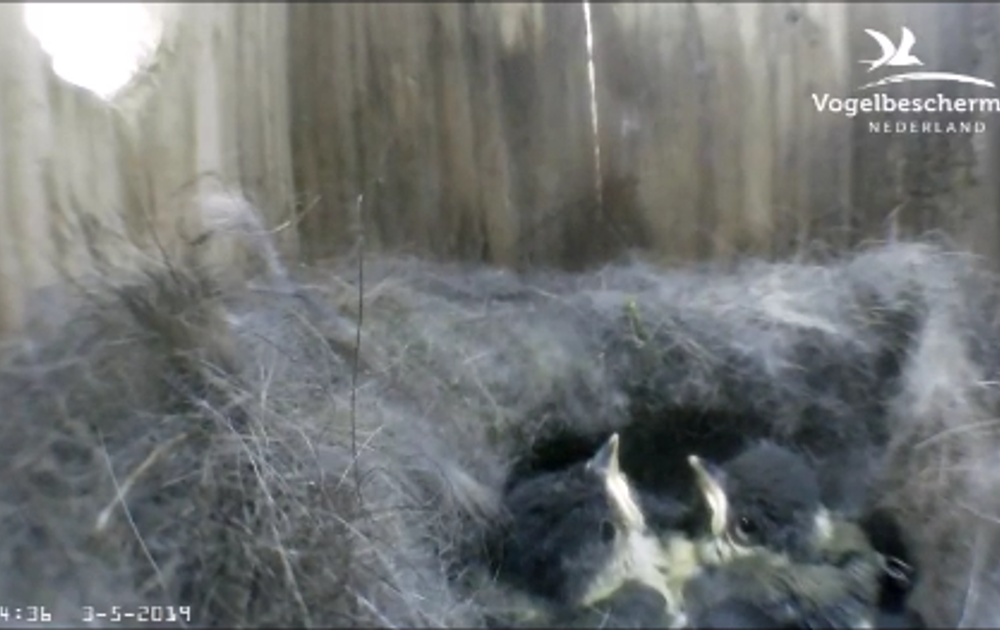 Het gaat nu wel erg hard met de jonge koolmeesjes. Bij sommigen zie je al zo goed als geen pennen (waar de veertjes opgerold in zaten) meer, en krijgen al een heus mezen verenpak. Vandaag hoor je voor het eerst de bedelgeluidjes