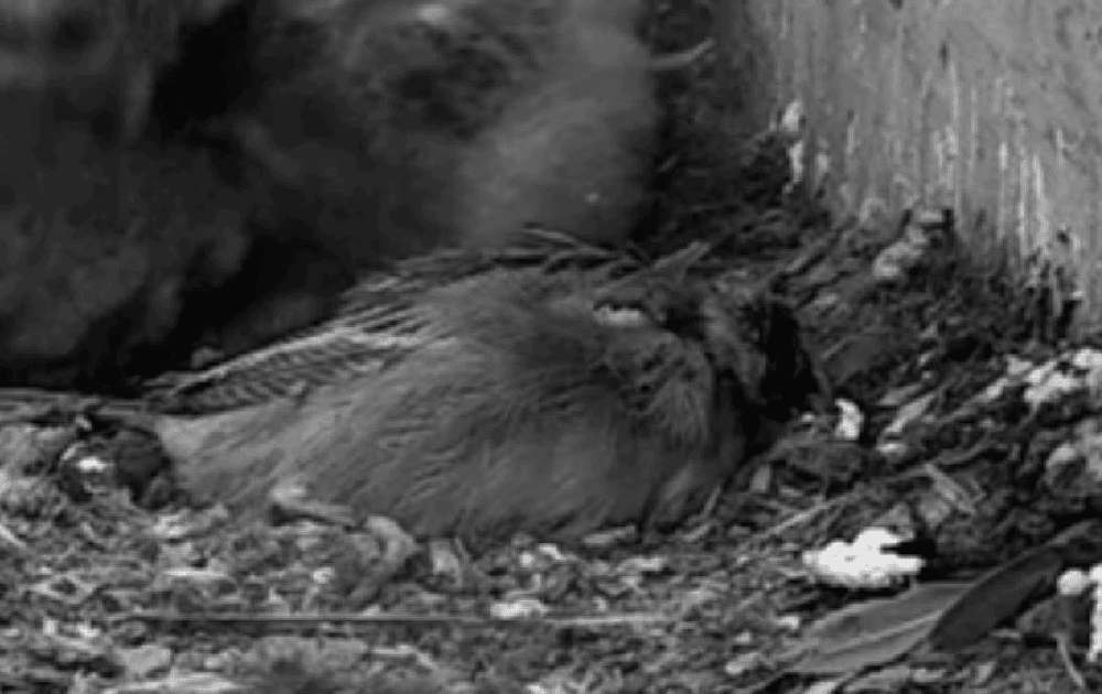 In de vroege morgen brengt vrouw steenuil twee buiten beeld van man verkregen kleine vogels in de nestkast en gaat de vogeltjes voeren aan de kuikens.
