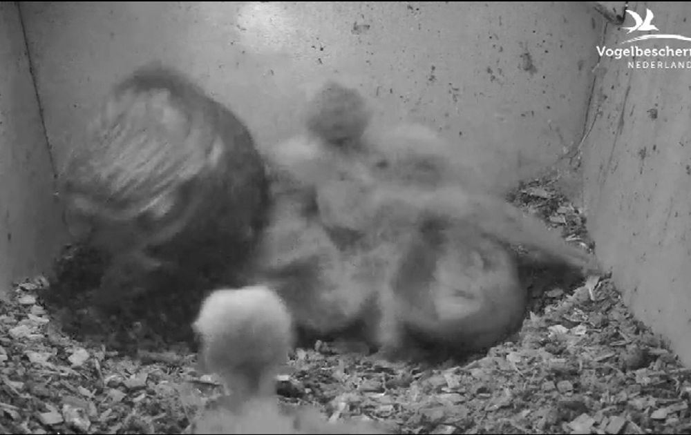 De drie grootste jongen komen vlak bij de vliegopening terecht. Uk blijft midden in de kast achter. Man steenuil voert door het gat, dan heeft uk geen kans. Vrouw komt wel de kast in en dan krijgt de kleine de meeste prooien.