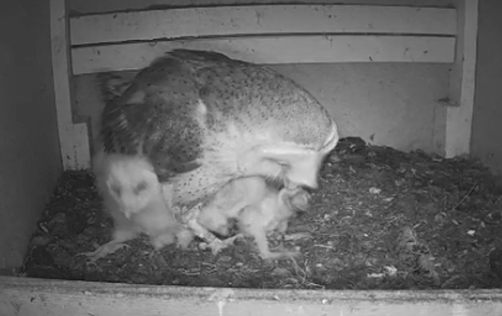 Ook het vrouwtje gaat nu regelmatig op jacht om alle snaveltjes te kunnen voeden, de oudere kuikens eten nu geheel zelfstandig, de kleintjes zijn nog afhankelijk van het vrouwtje.