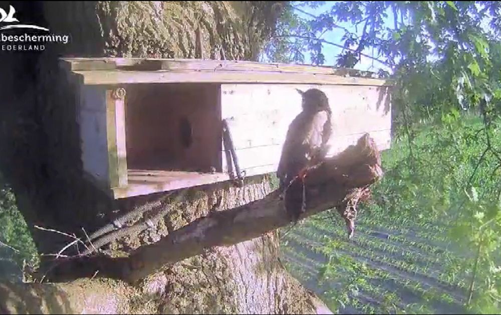 Een grote bonte specht doet groot onderhoud aan de "uitvliegtak".