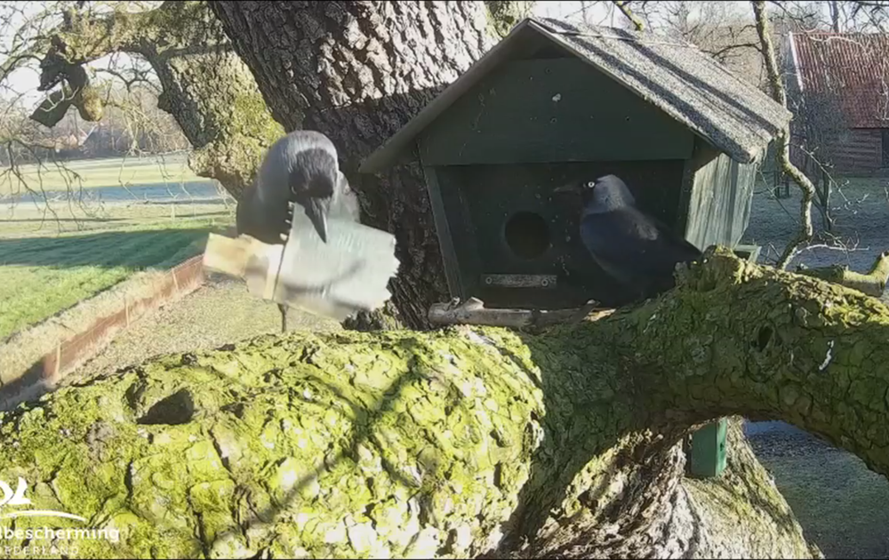 Vrouw steenuil zit de hele morgen en het begin van de middag in de nestkast. Ondertussen komen kauwtjes een paar keer klussen. Of misschien beter: ze verrichten sloopwerk.