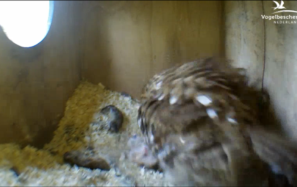 Bij een draai, valt het kuiken op de rug en kunnen het goed zien. Even lijkt vrouw bosuil met haar jong te knuffelen (snavelen).