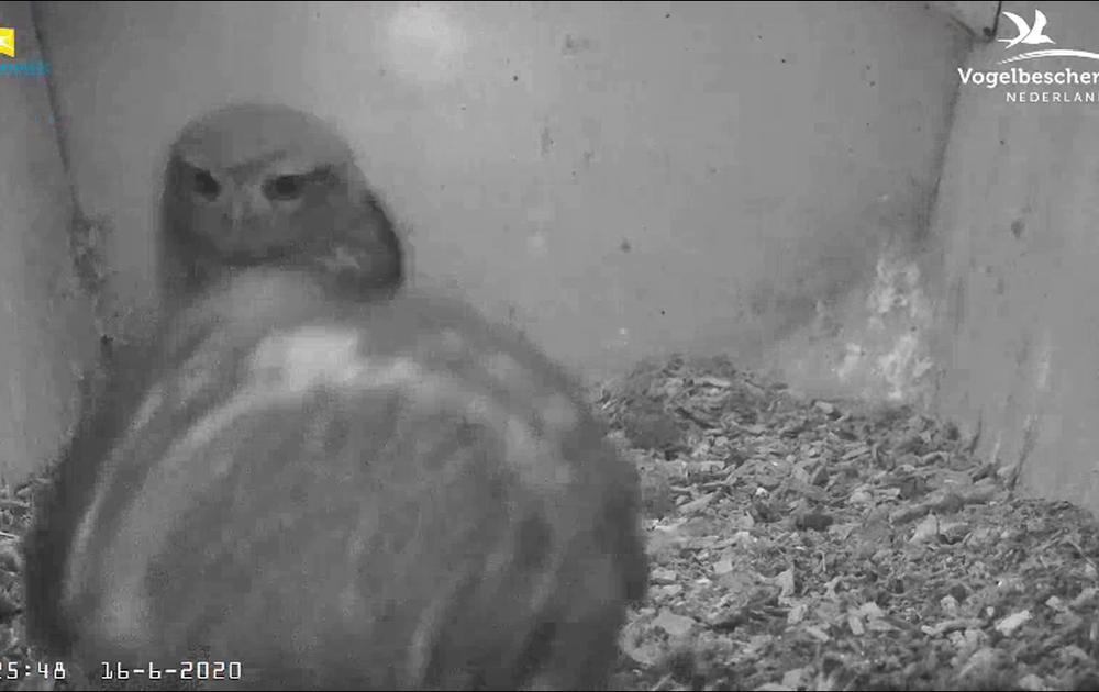Man steenuil benut zijn kans en knuffelt een (bedelende) jong in de nestkast.