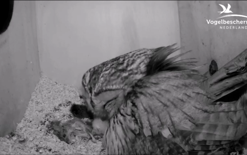 Al een dag met z'n tweeën in de kast. Vrouw bosuil waakt voortdurend over het welzijn van het kuiken. Daar hoort ook zo af te toe een knuffeltje bij.