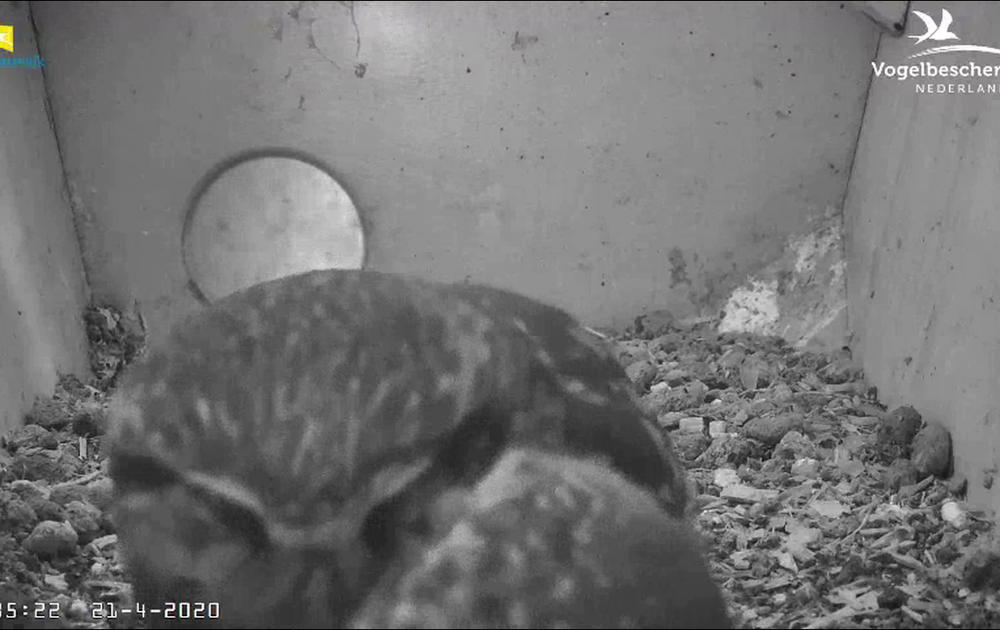 Vrouw en man steenuil poetsen elkanders nekveren, terwijl vrouw steenuil verder broedt.