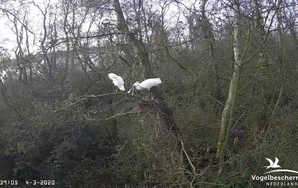 Een kort bezoek van 6-8 lepelaars vanmorgen. Verkenning van het nest en territorium afbakening met wat stoeien hier en daar.