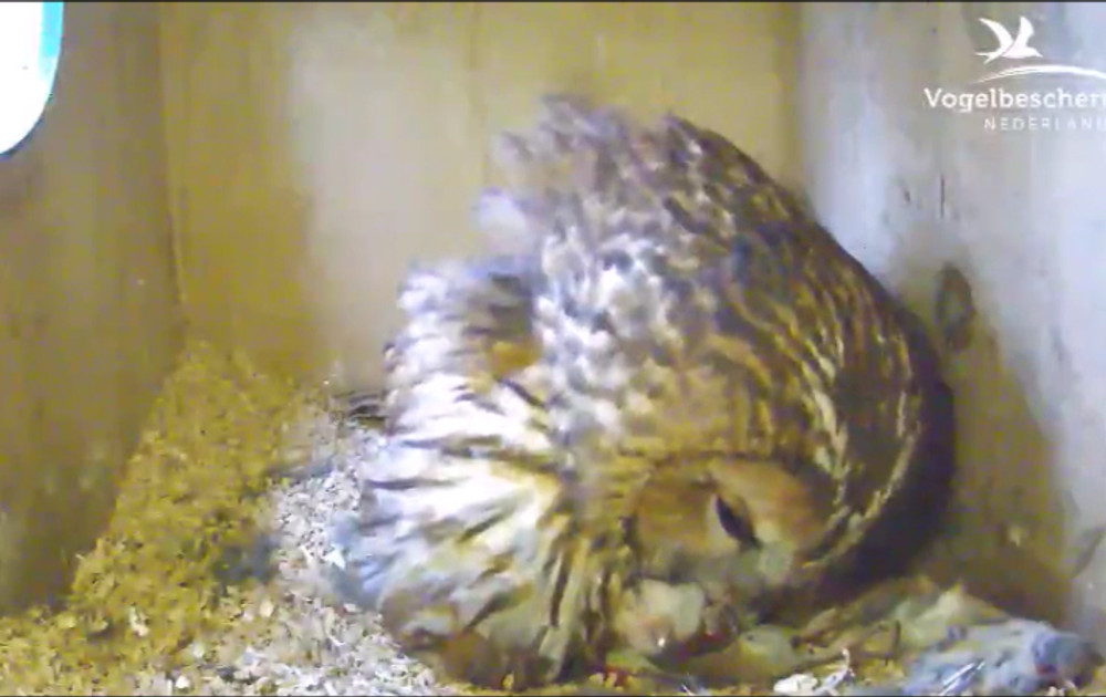 Vannacht heeft het kuiken al een paar keer wat eten gekregen. Nu zit vrouw bosuil goed voor de camera en geeft ze haar jong ‘hapjes muis’.