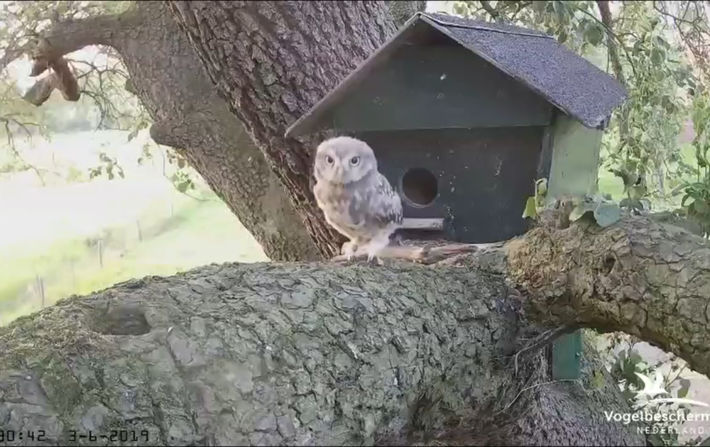 Het kuiken -met een ring om de rechterpoot- wandelt over de tak voor de nestkast. Voor het eerst een kuiken echt uit de kast. Op de 34e dag na het het uit het ei komen.