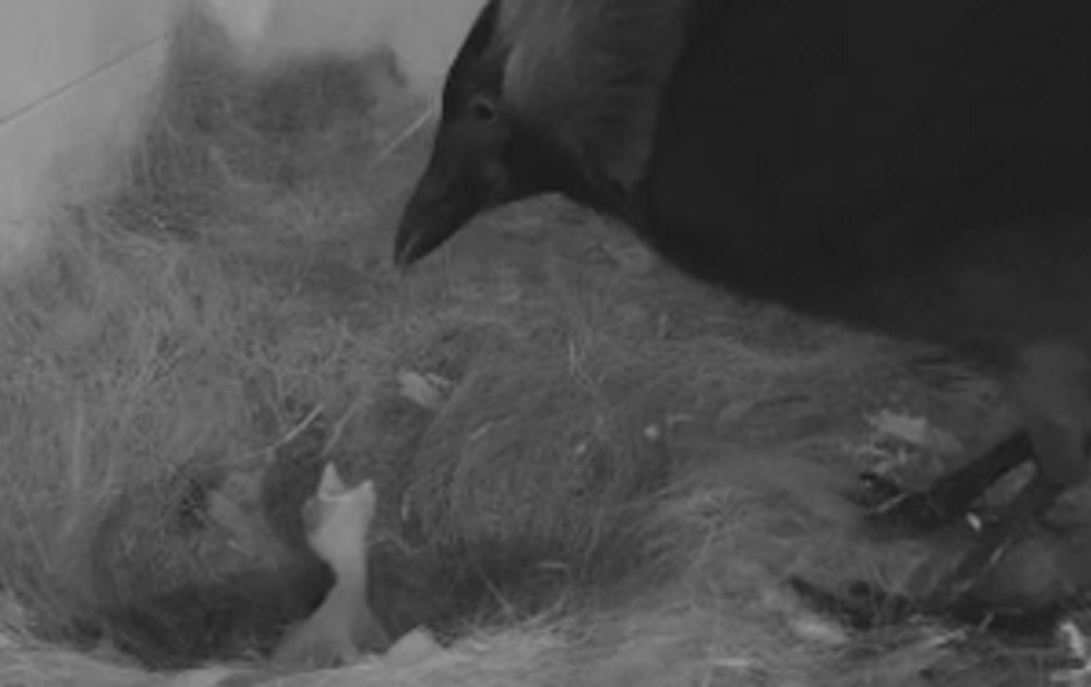 Vanmorgen rond 6:15 uur is het eerste kauw-kuiken uit het ei gekropen.