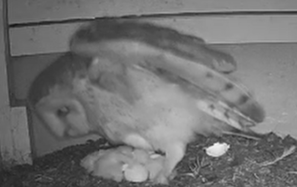 Rond 20:30 is kerkuilskuiken nummer 3 uit zijn/haar ei gekropen, dat wordt hard werken voor mevrouw uil om nu al drie snaveltjes te vullen.