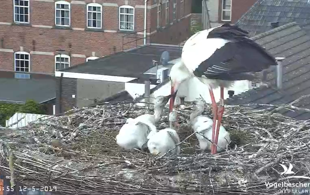 De drie overgebleven kuikens zijn al best groot. Voor Pa en Ma, zeker nu het droger is, een erg grote opgave om voldoende voer aan te leveren. Komen ze dan met voer, dan zijn de kuikens erg ongeduldig.