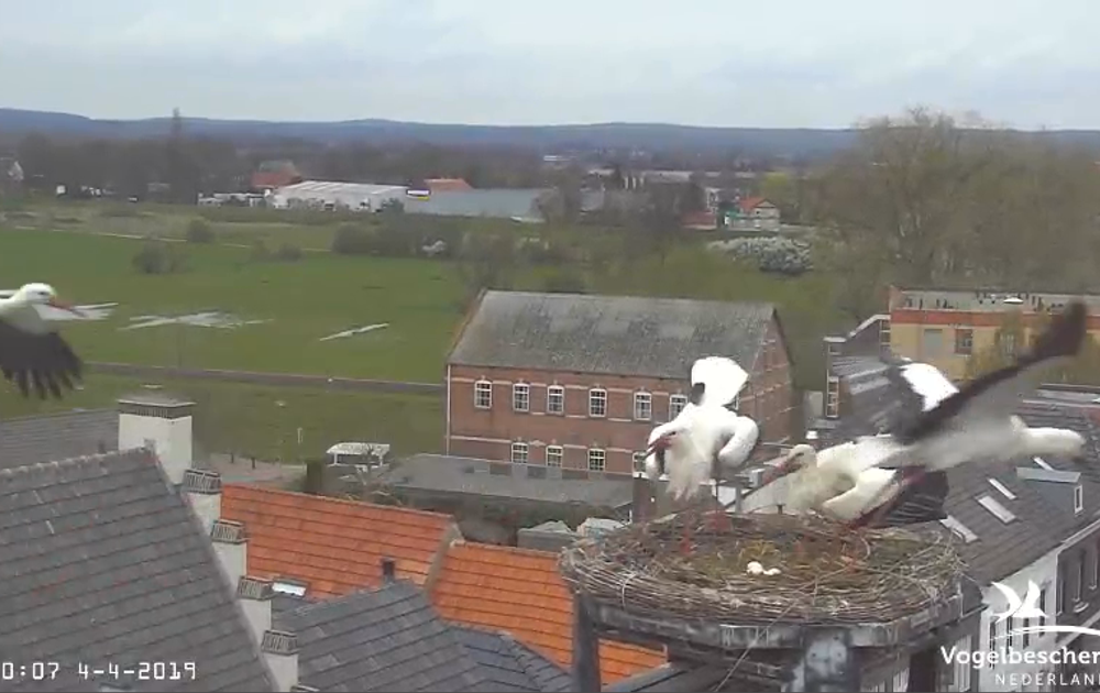 Meerdere keren per dag vliegen twee vreemde ooievaars rondom het nest. Of dit de ooievaars van het nabij gelegen nest in Beugen zijn, is niet duidelijk. De beelden gaan te snel om te zien of de ooievaars geringd zijn, welke kleur de ring heeft en het nummer is al helemaal niet te zien.