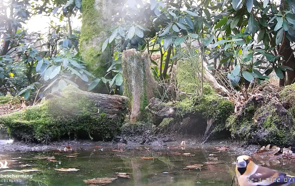 De afgelopen dagen lag de vijver vrijwel de gehele dag vol ijs, maar vanmogen een ijsvrije vijver en daar maakt deze Appelvink gebruik van.