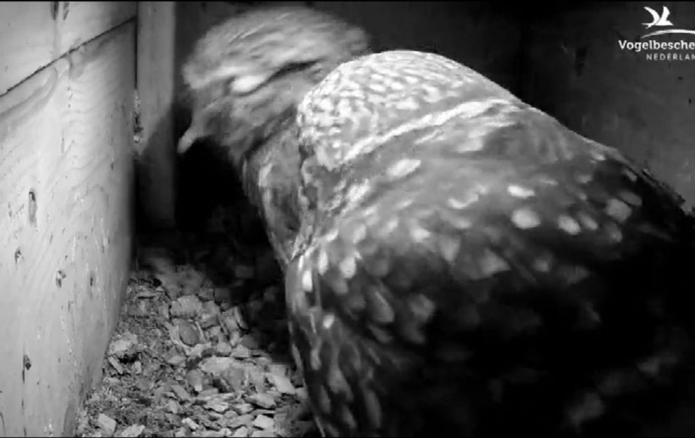 Man steenuil brengt een larve bij vrouw, die op de 2 eitjes zit. Zij zal trouwens 2 min. hierna vertrekken en nog niet gaan broeden.