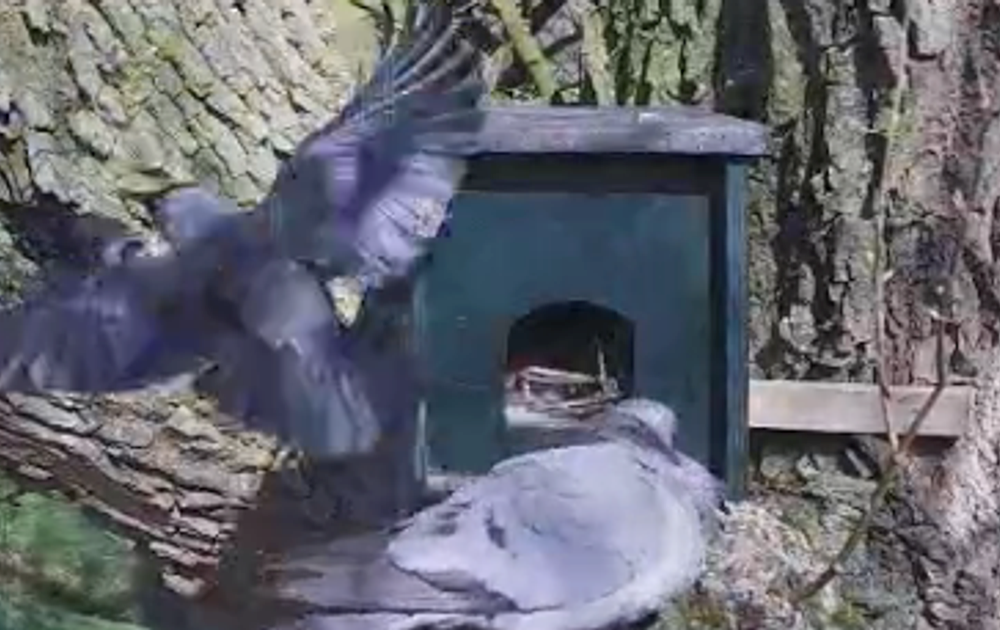 De duiven blijven de kauwen lastig vallen, al komen ze niet meer naar binnen: ondoordringbaar door de stapel takken.