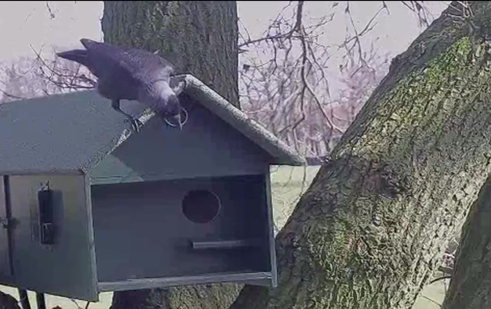 Vrouw steenuil is in de nestkast. De rust wordt verstoord door de "oude" bekenden holenduif en kauwtjes, maar ook door een hommel. Man steenuil wordt weggejaagd door iets groots. Niet goed te zien, maar waarschijnlijk een kerkuil of een bosuil.