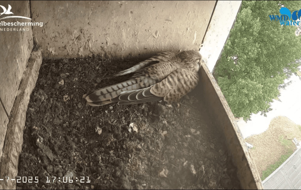 Een van de jonge torenvalken gaat er eens lekker bij liggen. Er wordt zelfs geschuddeld zoals bij het broeden.