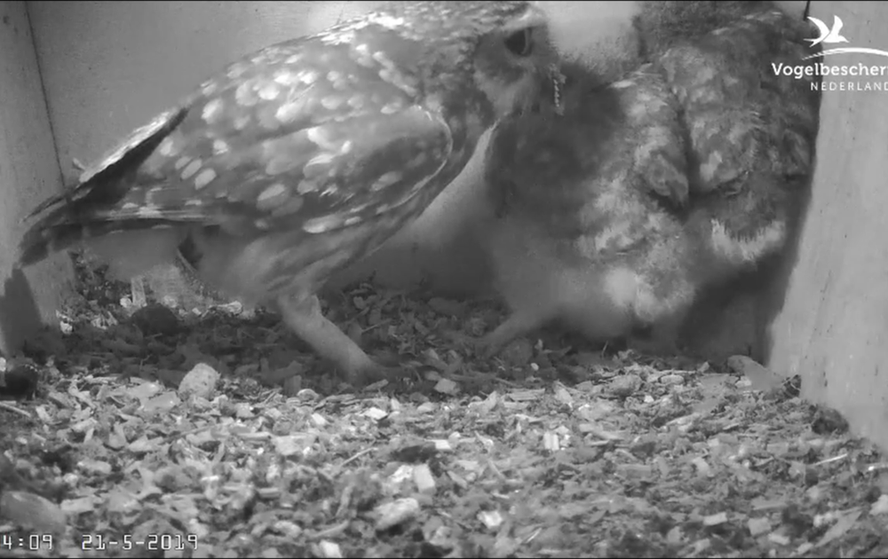 Man steenuil tracht een meikever aan de kuikens te geven. Aandringen helpt niet.