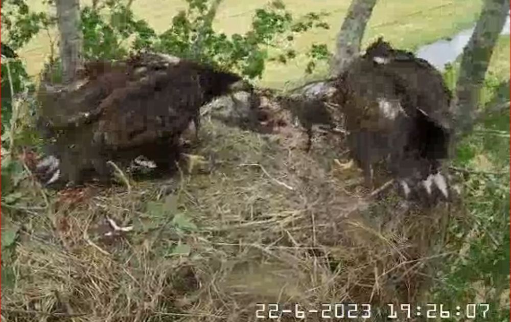 Onrustig fladderen de jongen naar en op de rand van het nest. Vechten om een prooi. Kijken naar beneden.