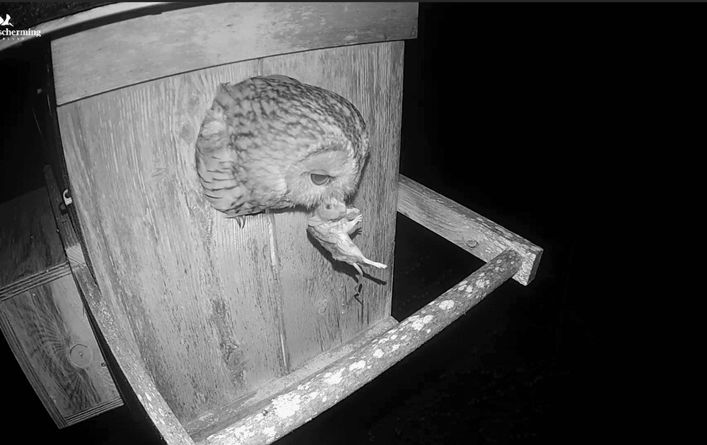 Het regende behoorlijk, Man bosuil hield er ook een leuk kapsel aan over. Al die regen mocht de pret niet drukken, maar liefst 6! prooi overdrachten vannacht.