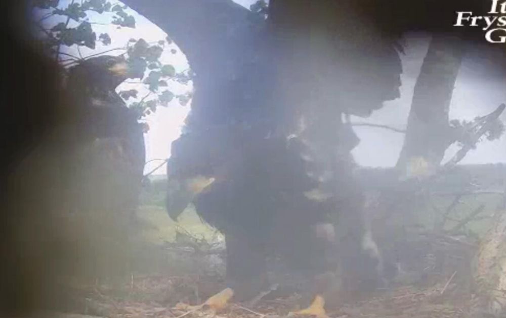 Ondanks dat het beeld verre van ideaal is, kunnen we goed zien dat de zeearend kuikens geen kleintjes meer zijn.