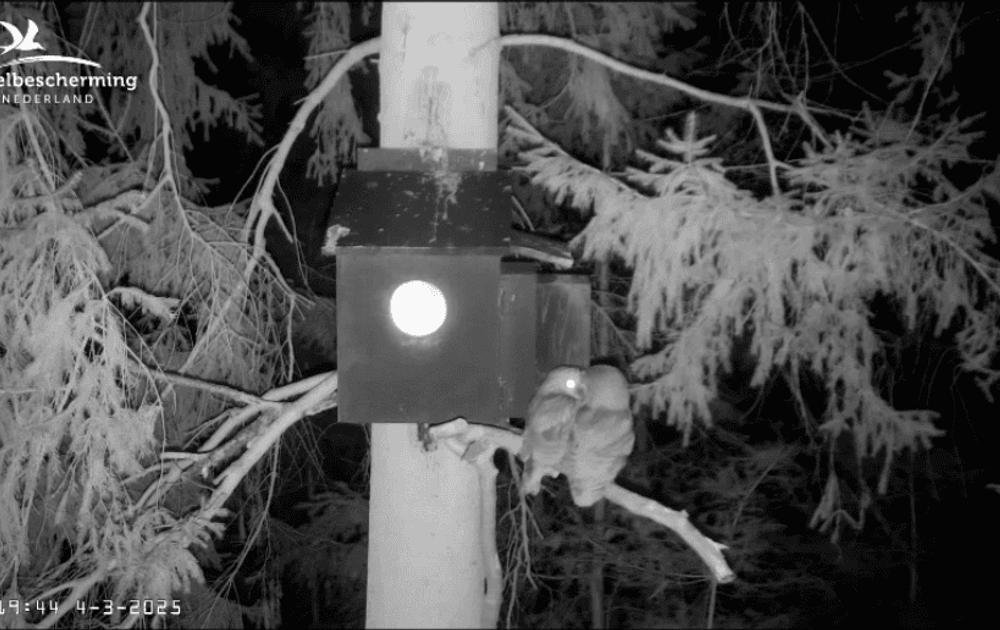 ....in elk geval voor de kast zagen we vannacht. Het lijkt nu hard te gaan met die twee. Helaas kwam een uil niet helemaal in de kast. Daardoor was niet te zien of die geringd was (vrouw van vorige jaren). We nemen aan dat het man bosuil was die tweemaal de kast in ging.