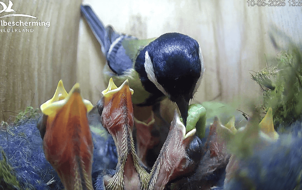 De koolmeesjes groeien in rap tempo, hun ogen beginnen te openen en er verschijnen hun eerste veertjes. Geen wonder met zulke feestelijke maaltijden.