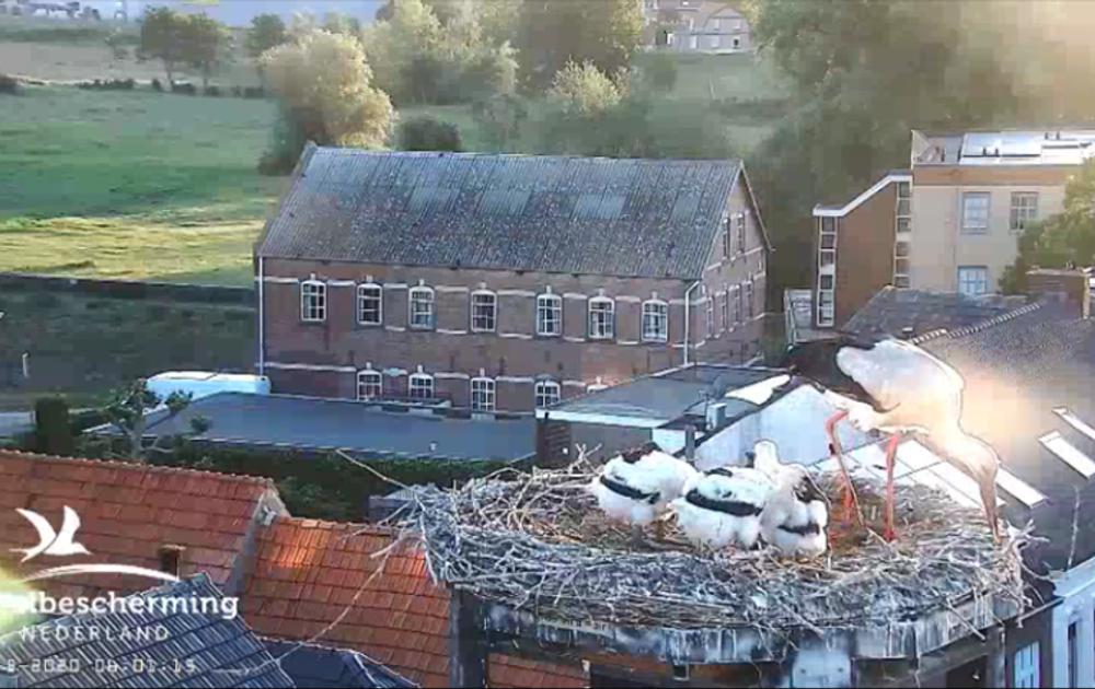 ’s Ochtends vroeg zijn beide ouders al vroeg weg. Pa is al eerder teruggekomen met eten. Nu komt Ma Terug. Ze heeft haar snavel zo vol dat ze het voedsel nauwelijks kan binnenhouden. En omdat niemand het doet, zet ze zichzelf daarna maar in het zonnetje.