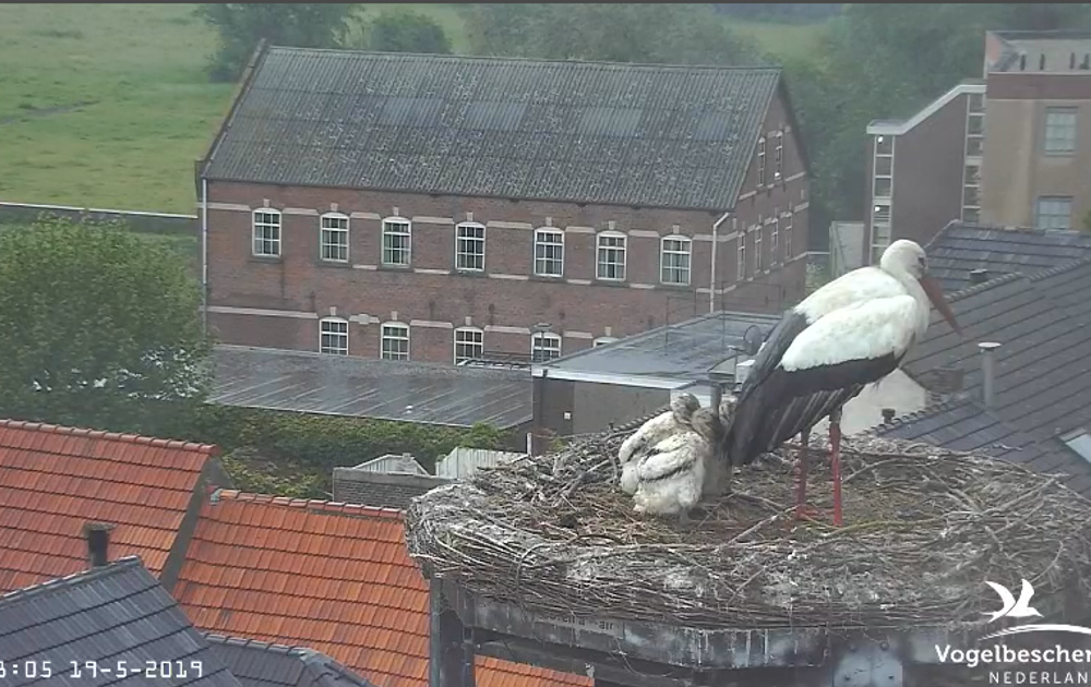 Als de zon schijnt of als het regent, beschermen de ooievaars hun kuuks door als een parasol/paraplu boven hen te gaan staan. Hier heeft Pa het niet zo goed begrepen.