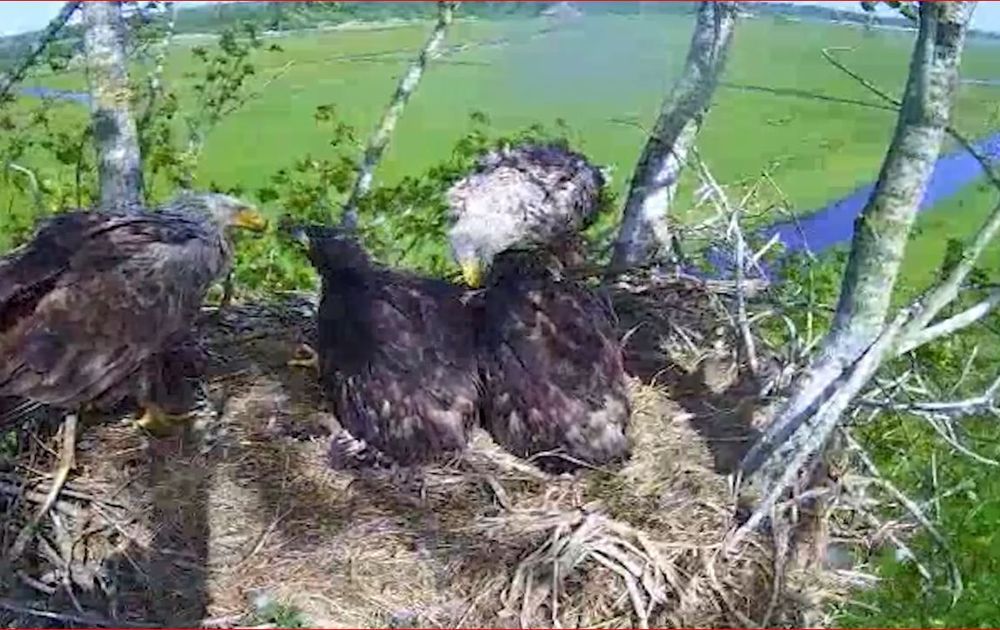 De kuikens moesten eergister voor het eerst zelf een prooi naar binnen zien te krijgen. Een dag later strijken de ouders met de hand over het hart en komen samen voeren.