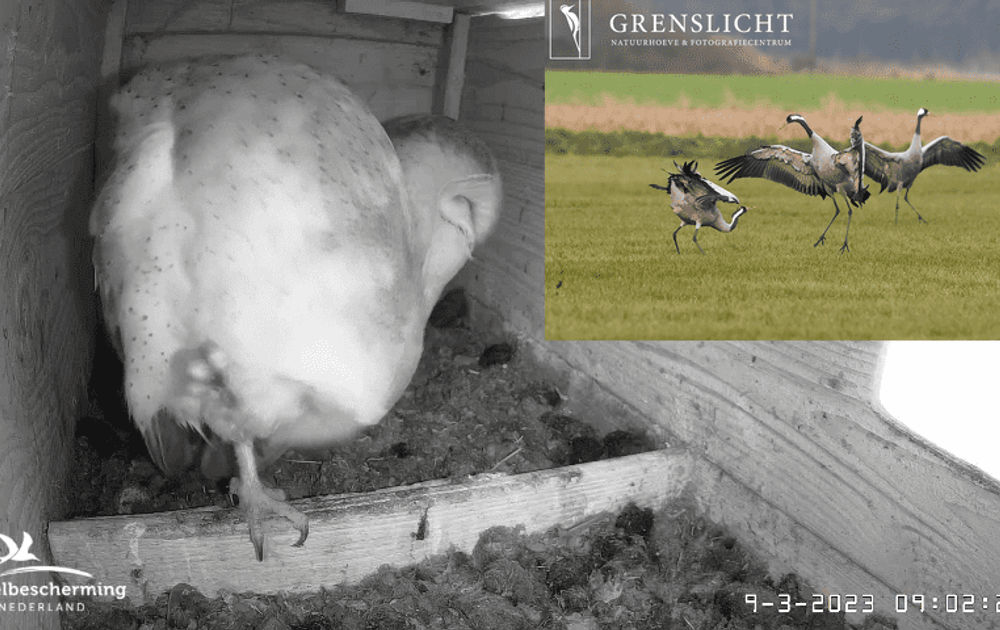 De uilen zijn in diepe slaap als een grote groep kraanvogels overtrekt, een aantal landt in het veld achter de hooiberg.