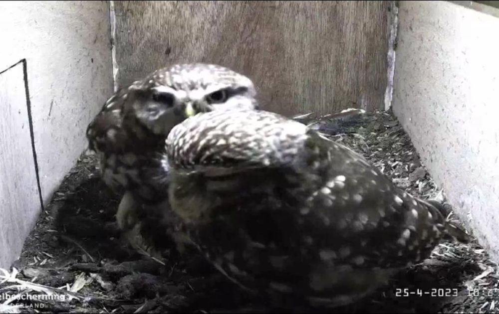 Na de overdracht van een prooi blijft Man steenuil in de nestkast rondhangen. Dat was in onbruik geraakt na het broedbegin. Maar hij ging als vanouds eten van de prooi, tokkelen, de muis aan de broedende Vrouw aanbieden. Vrouw probeert hem knuffelend de nestkast uit te sturen.