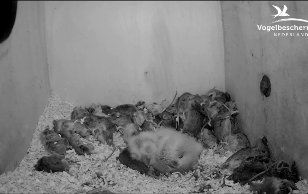 Vrouw bosuil is al even weg en we genieten van het kuiken dat alweer duidelijk gegroeid is. Dan komt man bosuil met een muis en geeft dat aan het kuiken. Voeren kan die niet zoals vrouw bosuil dat kan. Dan maar voor het kuiken neergelegd. De muis is warm en het kuiken gebruikt de prooi om heerlijk op te gaan liggen.