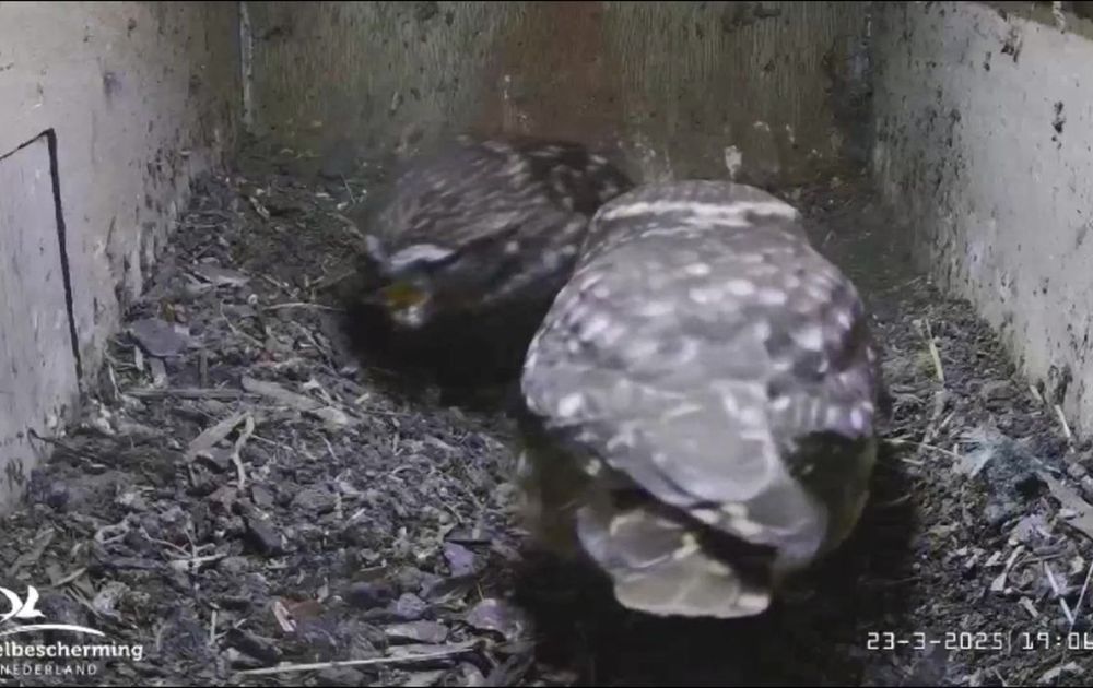 Voor het eerst dit jaar brengt Man steenuil een prooitje aan Vrouw in de nestkast.